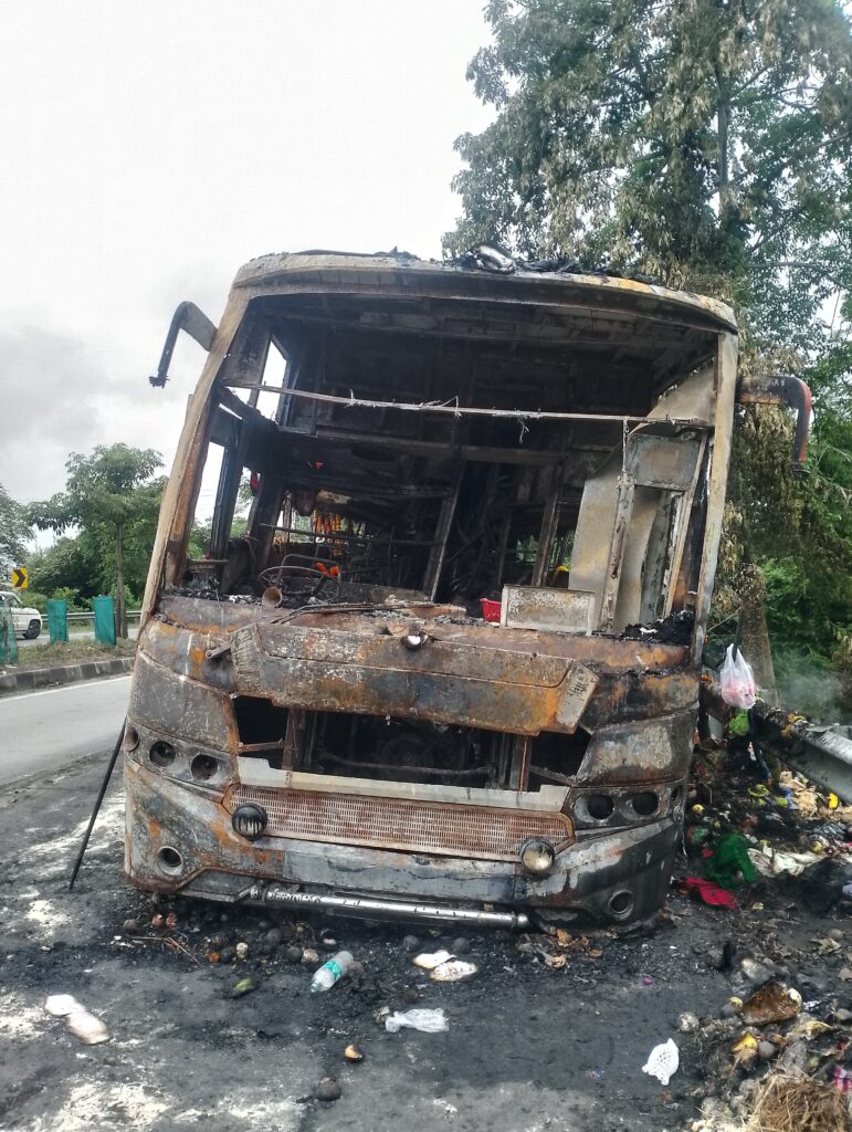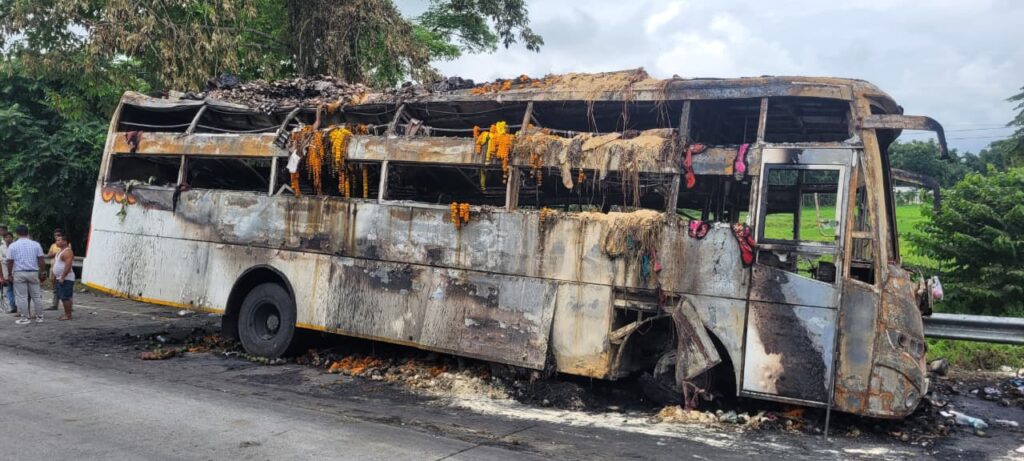 The incident took place at Patgaon along the National Highway at around 12.40 am in a devastating blaze that created caused on the bus.